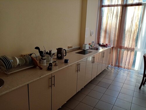 Кухня на отдельном этаже, мы пользовались ею для завтраков. Есть плита, 2 холодильника, микроволновка, много посуды.